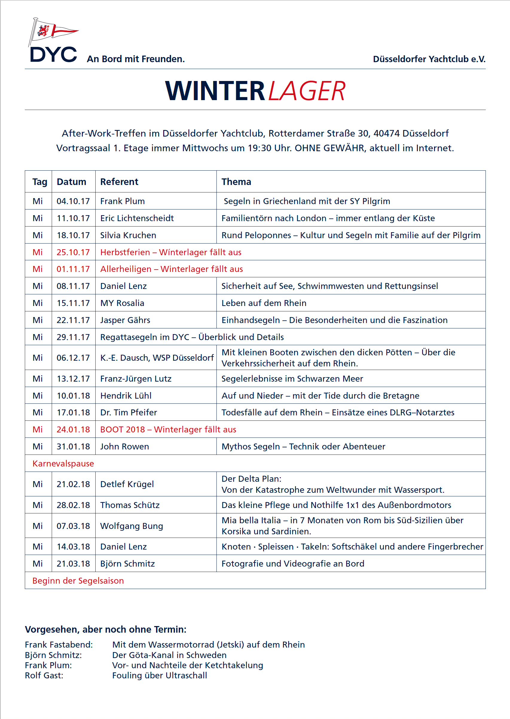 Das Gesamtprogramm ist immer aktuell auf DYC.de oder bei Facebook: www.facebook.com/Düsseldorfer-Yachtclub-eV-234222786592053/