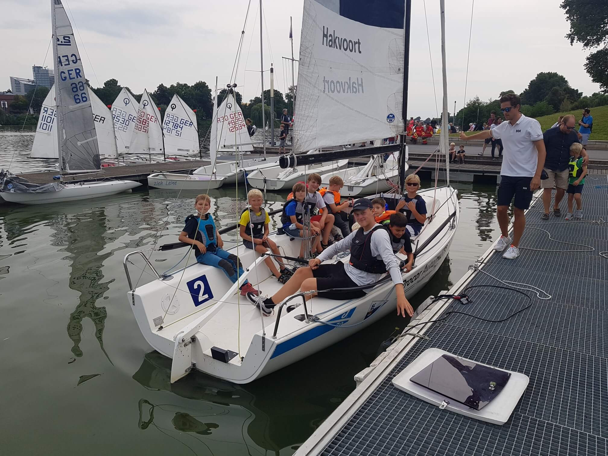 Nachdem nun wirklich Mangels Wind nichts mehr ging, packten die großen und kleinen Segler zusammen und holten die Boote aus dem Wasser. Die Renn Profis fuhren noch einmal eine Runde mit den Optikindern auf den J70 Rennyachten und dann gab es eine umjubelte – aber nicht wirklich ernsthafte- Siegerehrung.