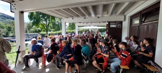 Nach dem ersten Segeltag und zwei gesegelten Läufen empfing der Segelclub Jülich die Seglerinnen und Segler sowie die weiteren Gäste zum Essen und zur anschließenden Party. Ca. 200 Segelsportbegeisterte wurden kulinarisch mit zwei Spanferkeln nebst Beilagen sowie vegetarischen Angeboten auf das Beste versorgt. Zur Unterhaltung spielte die Liveband „Nubblekombo“ während des Abendessens und sorgte für eine passende Umrahmung und fantastische Stimmung. Währenddessen wurden die Erlebnisse des ersten Regattatages lebhaft diskutiert.