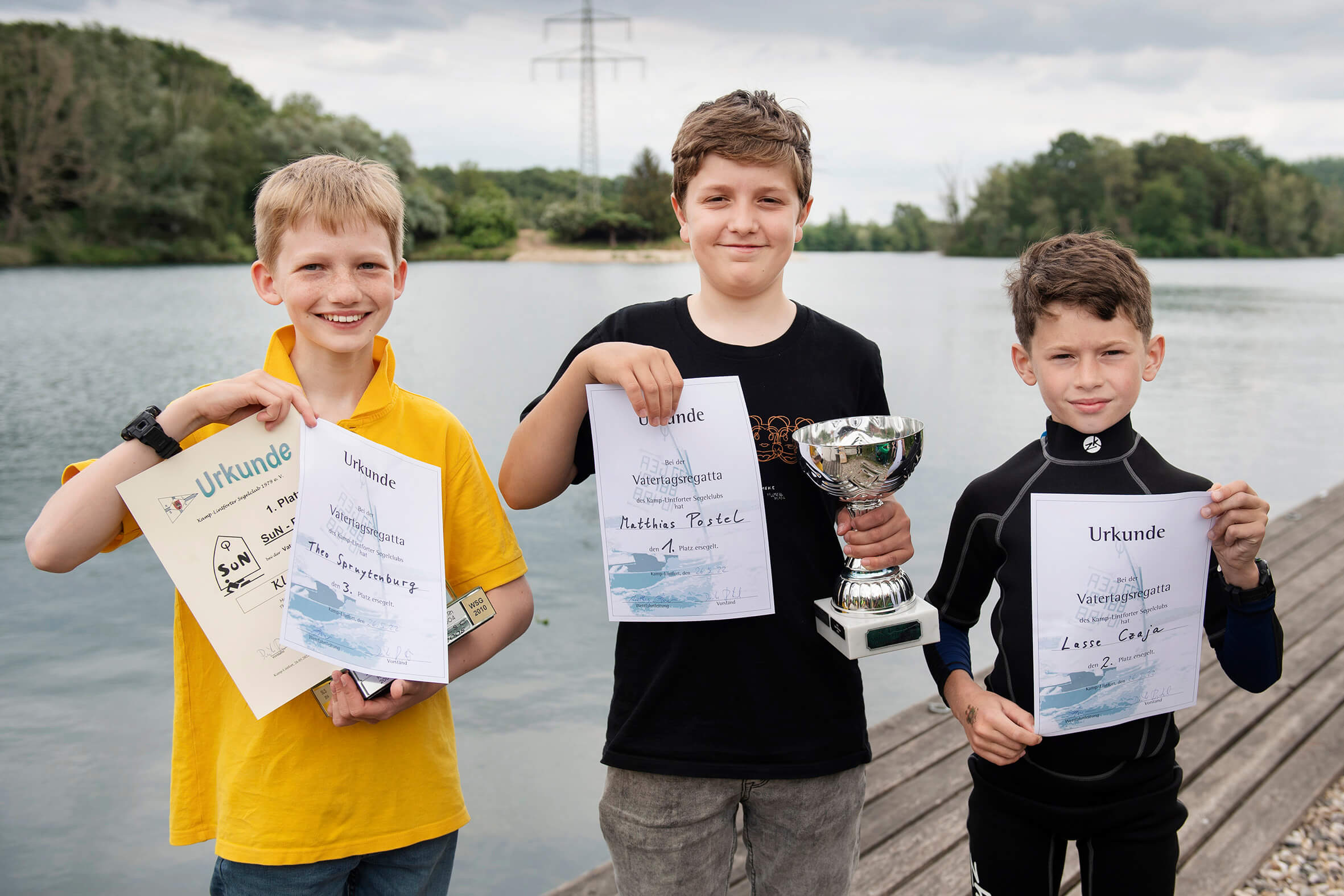 Den Vatertags-Regatta-Pokal sicherte sich Matthias Postel (KLSC), Lasse Czaja (2. Platz, WSG Gelderland) und Theo Spruytenburg (3. Platz, KLSC) freuten sich mit allen anderen