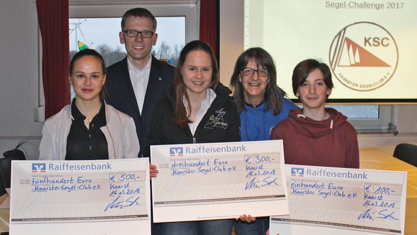 Am Freitagabend fand im Vereinsheim des Kaarster Segel-Clubs die Siegerehrung der „Hallo Zukunft - Die Segel-Challenge 2017“ statt. Im Rahmen des Wettbewerbs hatte der Kaarster Segel-Club seine Mitglieder dazu aufgerufen, sich sportliche Ziele für die Segelsaison 2017 zu setzen. Ein Jurygremium ermittelte die drei Sieger aufgrund ihrer persönlichen Leistungssteigerung, die sich dank einer Spende der Raiffeisenbank Kaarst über ein Preisgeld in Höhe von insgesamt 900 Euro freuen konnten.