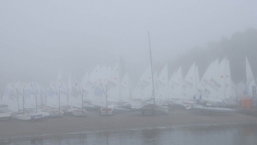 Sonntag dann die Überraschung! Entgegen aller Wetterprognosen zog 2 Stunden vor dem 1. Start so starker Nebel auf, dass die Hafenausfahrt von Land aus kaum noch auszumachen war. Erst war die Wettfahrtleitung noch sehr zuversichtlich, dass Sonne und Wind bald den Nebel verjagen würde. Doch leider hielt er sich hartnäckig, so dass um 13:30 Uhr ohne eine weitere Wettfahrt abgebrochen werden musste.