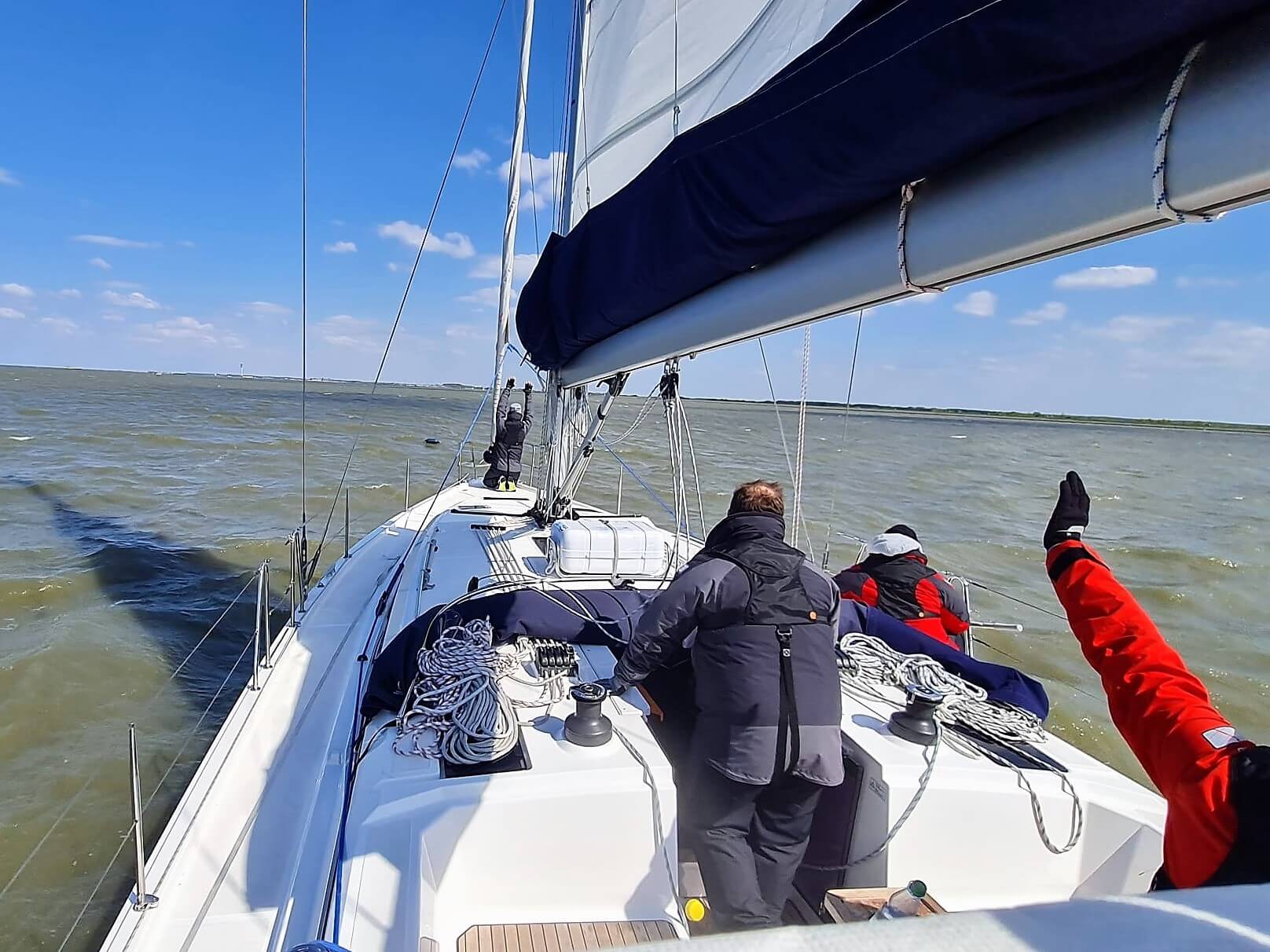 Die Crew der 42-Fuß Segelyacht „Katharina“ übt das Segelmanöver „Mensch-über-Board“
