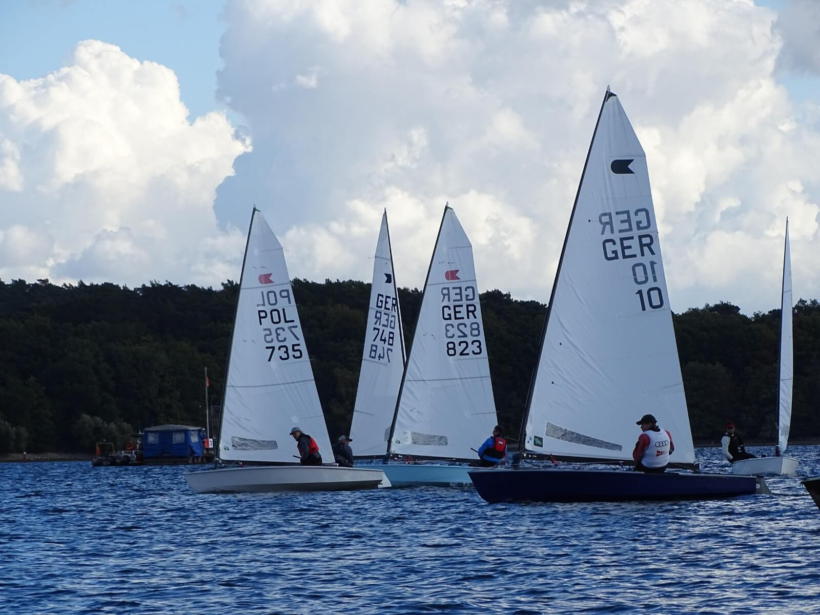 Sie lenken den Wind ab und verwirbeln ihn, was besonders an der Luvtonne zu spannenden Positionskämpfen führte, vor allem direkt nach den Starts, wenn das Feld noch dicht beieinander lag, mussten die Seglerinnen und Segler besonders aufmerksam sein. Insbesondere für einige Teilnehmer in der OK-Jolle mögen die Bedingungen in Haltern eine großer Kontrast zur vorherigen Regatta gewesen sein. Während der Europameisterschaft in Bandol an französischen Côte d´Azur segelten sie Anfang Oktober noch bei Mistral und bis zu zwei Meter Mittelmeerwelle.