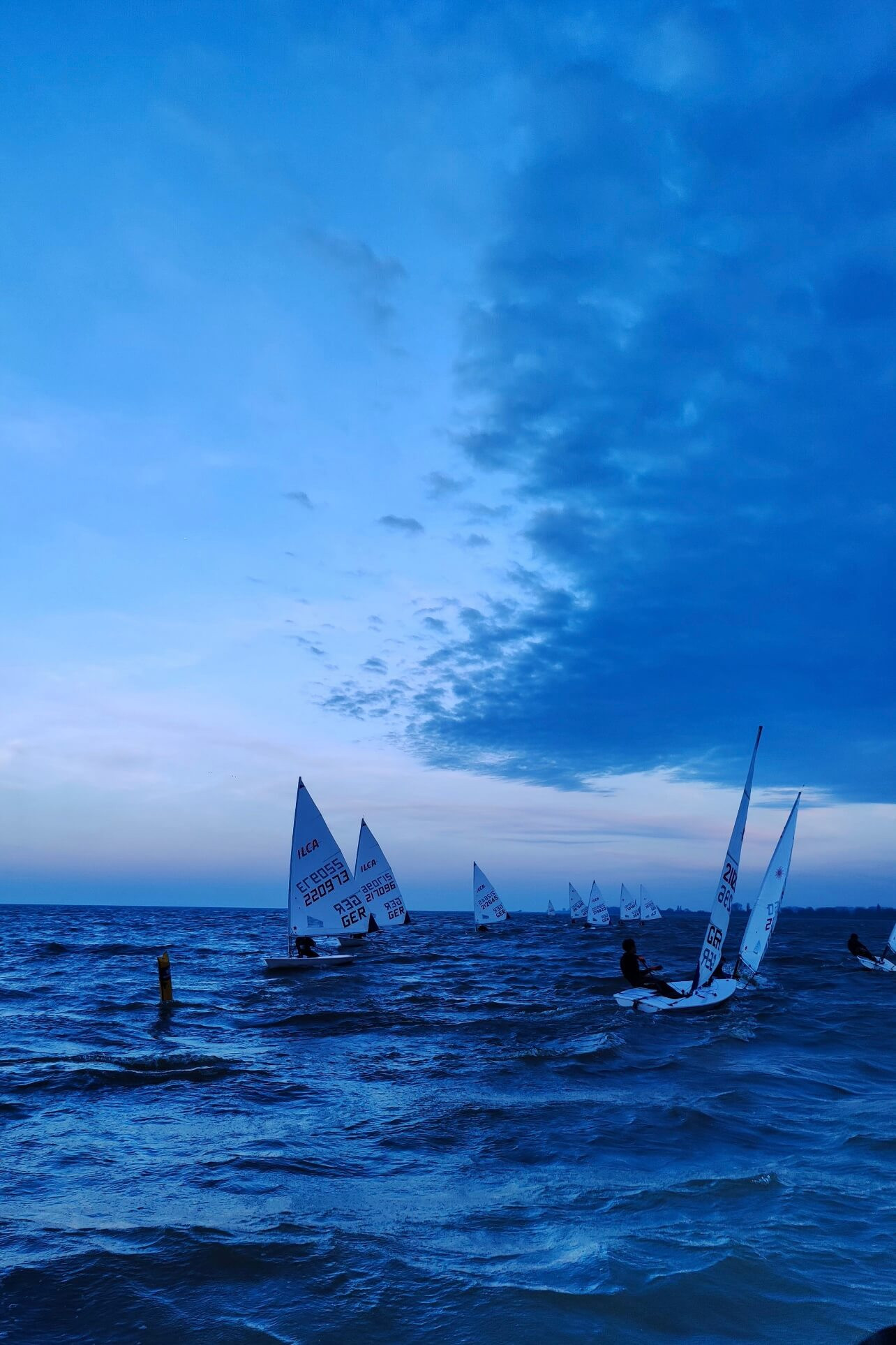 Am zweiten Tag des Trainings weht der Wind mit gut 17 Knoten aus Ost. Die durchziehenden Böen von bis zu 27 Knoten fordern die Segler zu Konzentration, Achtsamkeit und der ständigen Bereitschaft, das Boot voll auszureiten. Die wiederum fünf Trainingsgruppen (2x ILCA und 3x Opti) schließen sich bei den herausfordernden Bedingungen zum Teil für gemeinsame Trainingseinheiten und Läufe zusammen und können so auch die hin und wieder gekenterten Boote ausreichend unterstützen.
