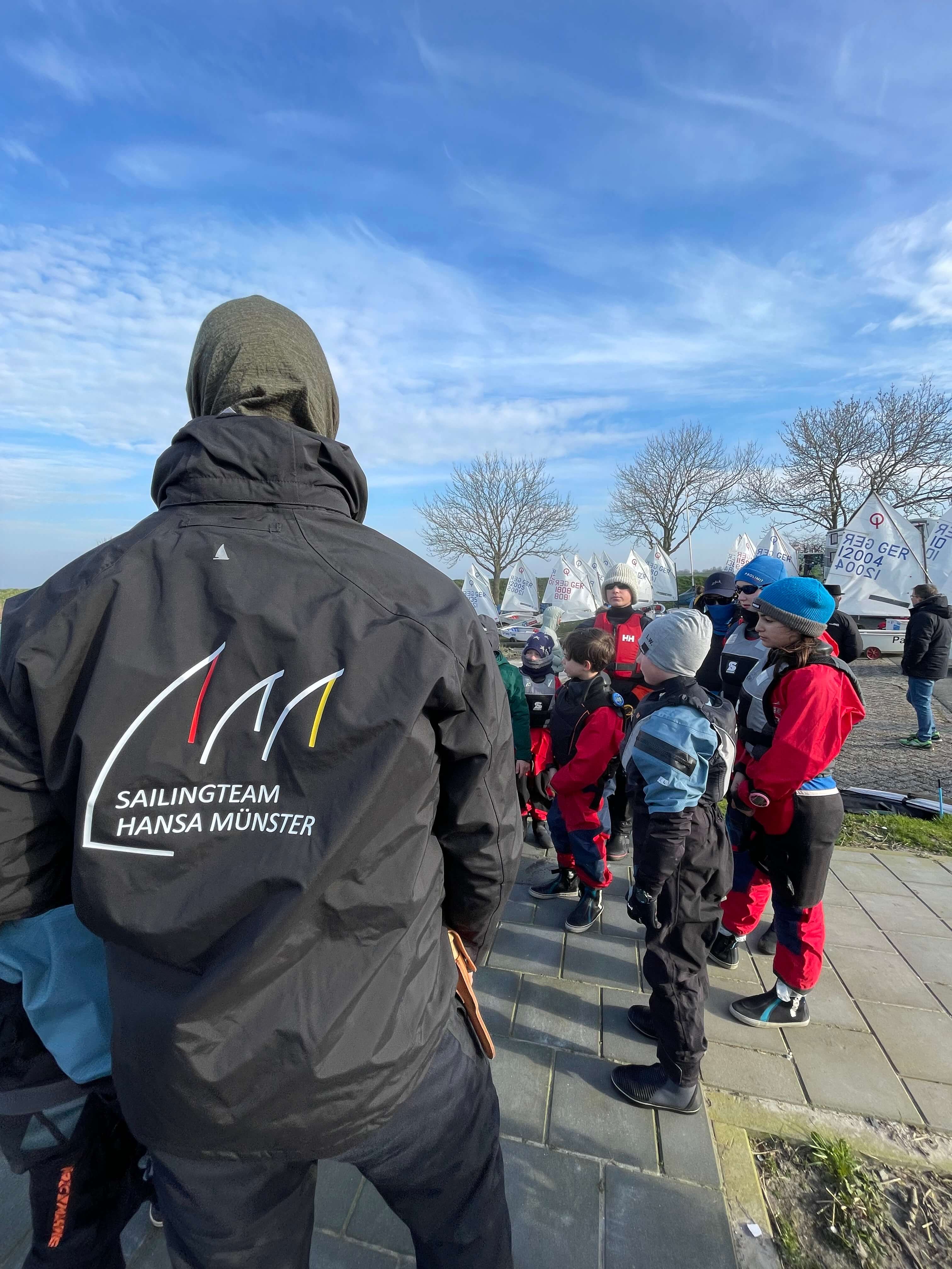 Ungewöhnlich, zu dieser Jahreszeit 45 Boote auf dem Wasser zu sehen. Wir werden gefragt, was hier los ist: hier findet bereits zum vierten Mal in Folge das zweitägige Training für Optis und ILCAs in Andijk vom Landesstützpunkt Münster statt, dieses Mal zeitgleich mit dem Training der Landesgruppe aus NRW und Niedersachen (Team West). Die 25 Seglerinnen und Segler vom Landesstützpunkt und weitere 15 vom Team West werden von fünf Trainern in fünf Motorbooten begleitet.