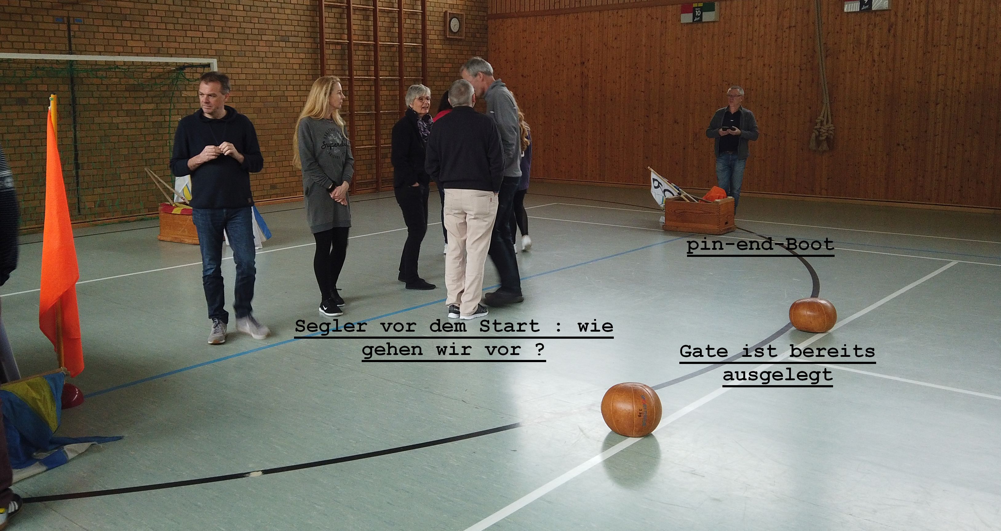 Das Gelernte wurde auch flott in Wettfahrten umgesetzt. Aber wie? Ganz einfach: mit Medizinbällen als Tonnen, kleinen Kästen als Begleitbooten und einem großen Kasten als Startschiff.