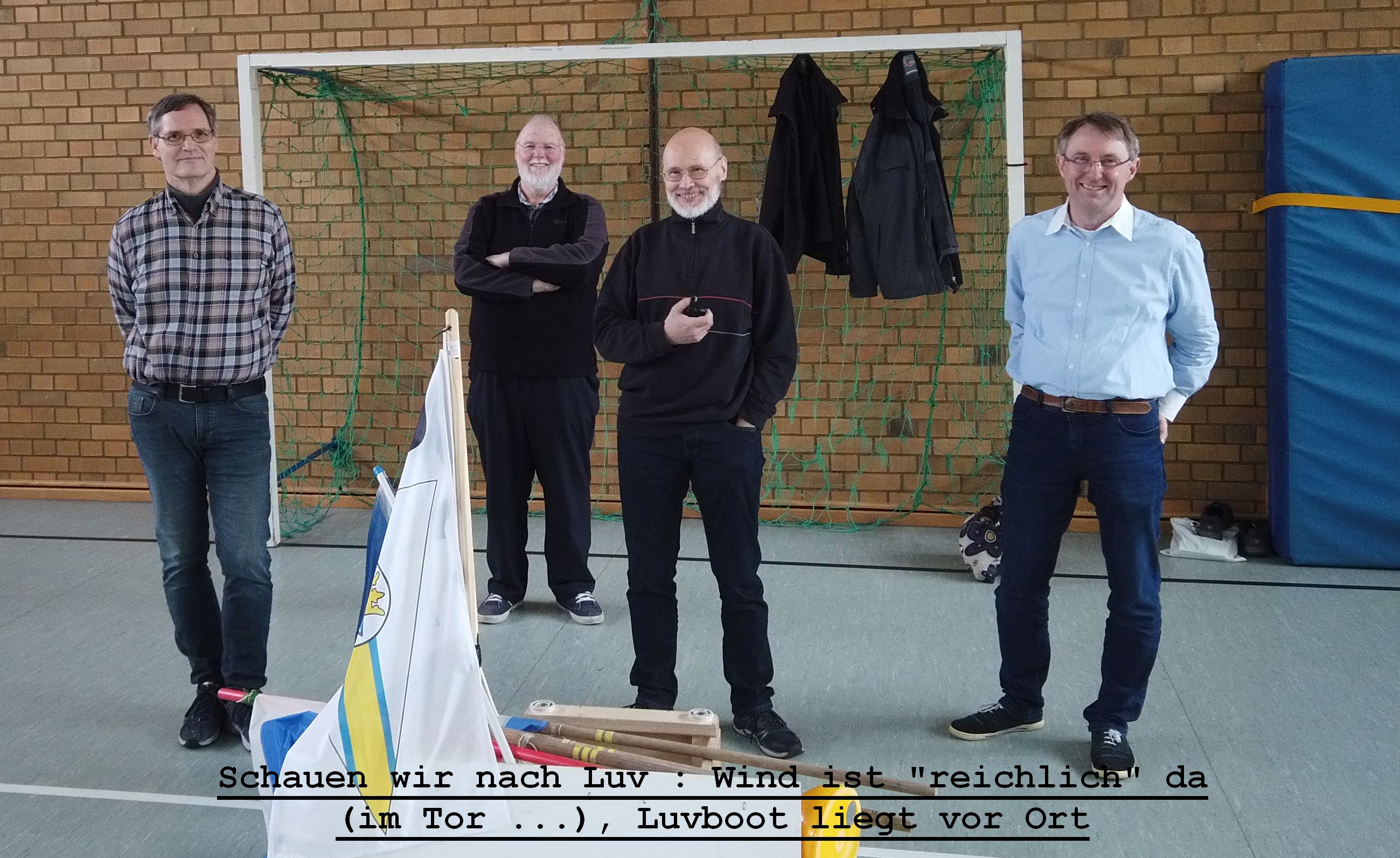 Die Teilnehmer wurden in „Funktionäre“ und Regatta-Teilnehmer eingeteilt, und dann gings es los. Natürlich hatten wir auch „Wind“ (Wolfgang Jentsch) in der Halle, leider genauso launisch wie im realen Leben: mal stetig (in) West, mal drehte sich der „Wind“, was eine Bahnänderung zur Folge hatte; oder er ging - einfach - weg: Abbruch!