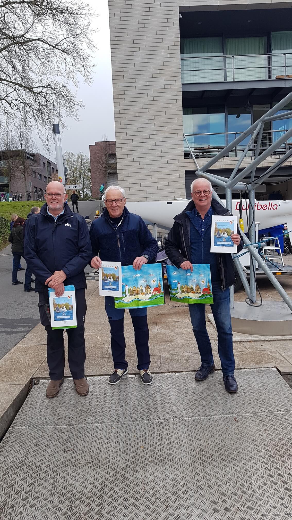Der Sonntag brachte dann zwar auch noch Temperaturen um gerade mal 5 Grad, aber zwischendurch etwas Sonnenschein und Wind bis zu drei Windstärken aus der schwierigen Windrichtung West-Nord- West. Wettfahrtleiter Uwe Holzhäuser und seine Crew versuchten die Bahn (und den Aasee) zu drehen um es so gut wie möglich zu machen- aber diese Richtung ist auf den Aasee fatal und sehr schwierig zu segeln. Aber egal wie Wind und Wetter waren, an Altmeister Ulli Libor kam keiner vorbei – er fuhr fünf erste Plätze und das bei der guten Konkurrenz. Dahinter schaffte es der einheimische SCM Segler Andreas Greufe mit den Plätzen 4,2,2 (9) 5 auf Platz Zwei vor Henk van Heuveln 2,(6)5,4,6 aus den Niederlanden auf Platz 3.