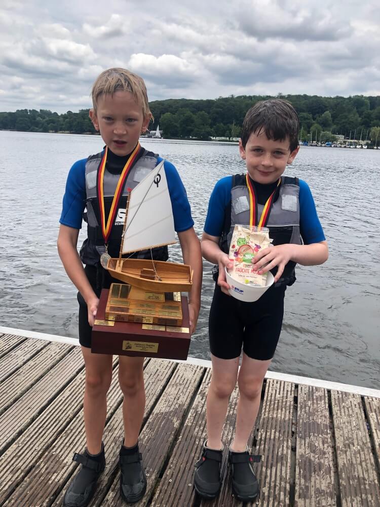 Der krönenden Abschluss gelang dem Duo um Tom Winkelmann (8) und Julius Unger (8) jedoch am letzten Wochenende in Essen auf dem Baldeneysee. Bei insgesamt 30 Teilnehmern in den Gruppen Opti A und B erreichten die Münsteraner Segler jeweils eine absolute Top Platzierung. Bei gutem Wind um 2-3 Beaufort segelten die jungen Münsteraner SCM Segler in Ihren Optimisten vier Läufe. Am Ende konnte Julius Unger die Regatta des ETUF klar für sich entscheiden. Mit den Plätzen 2/1/1/1 siegte er vor seinem Kumpel Tom Winkelmann, der ebenfalls mit einer beeindruckenden Serie von 1/2/2/2 den zweiten Platz erreichte. Das Siegerduo aus Münster kann sich mit dieser fulminanten Siegesserie glücklich in die bevorstehende Sommerpause verabschieden.