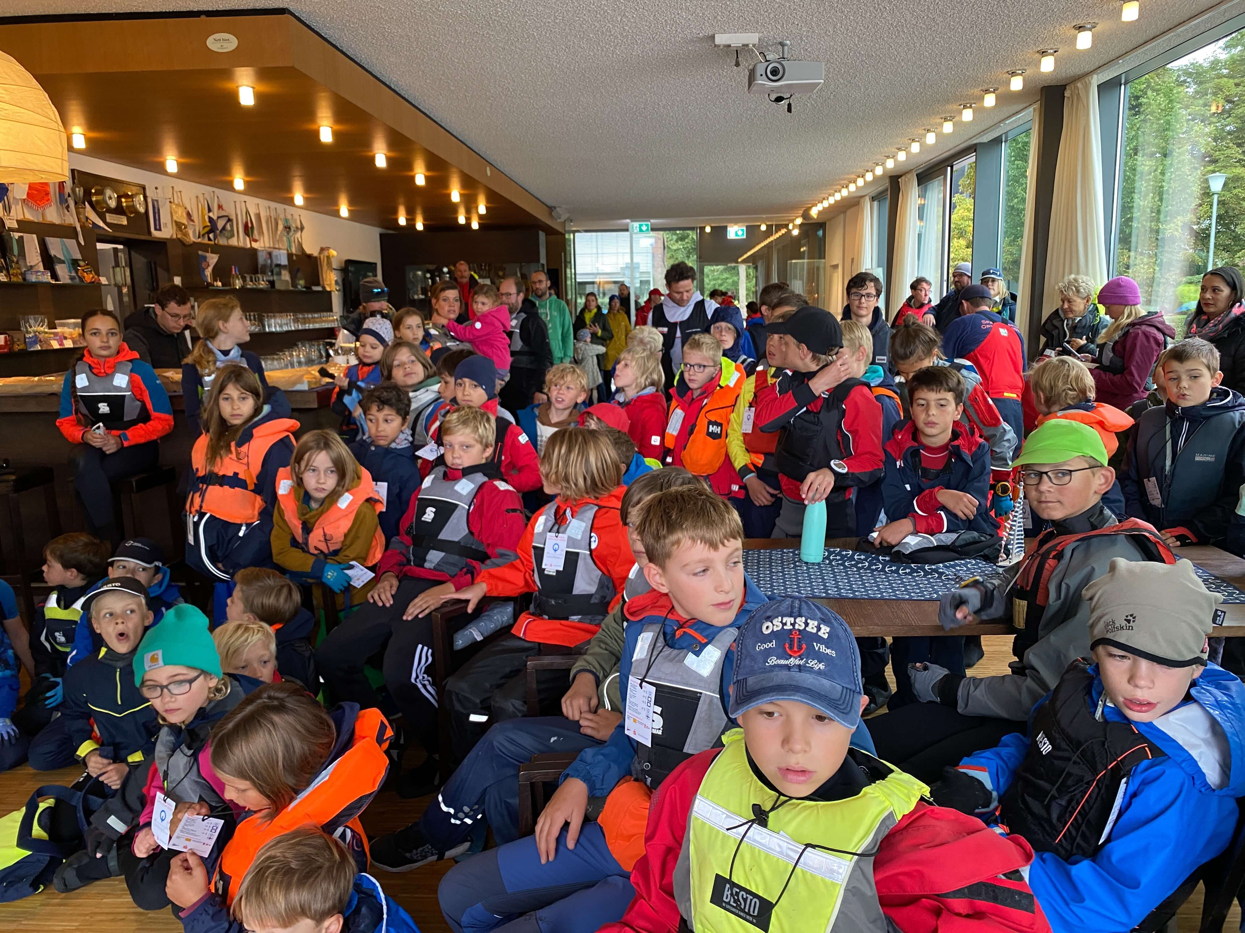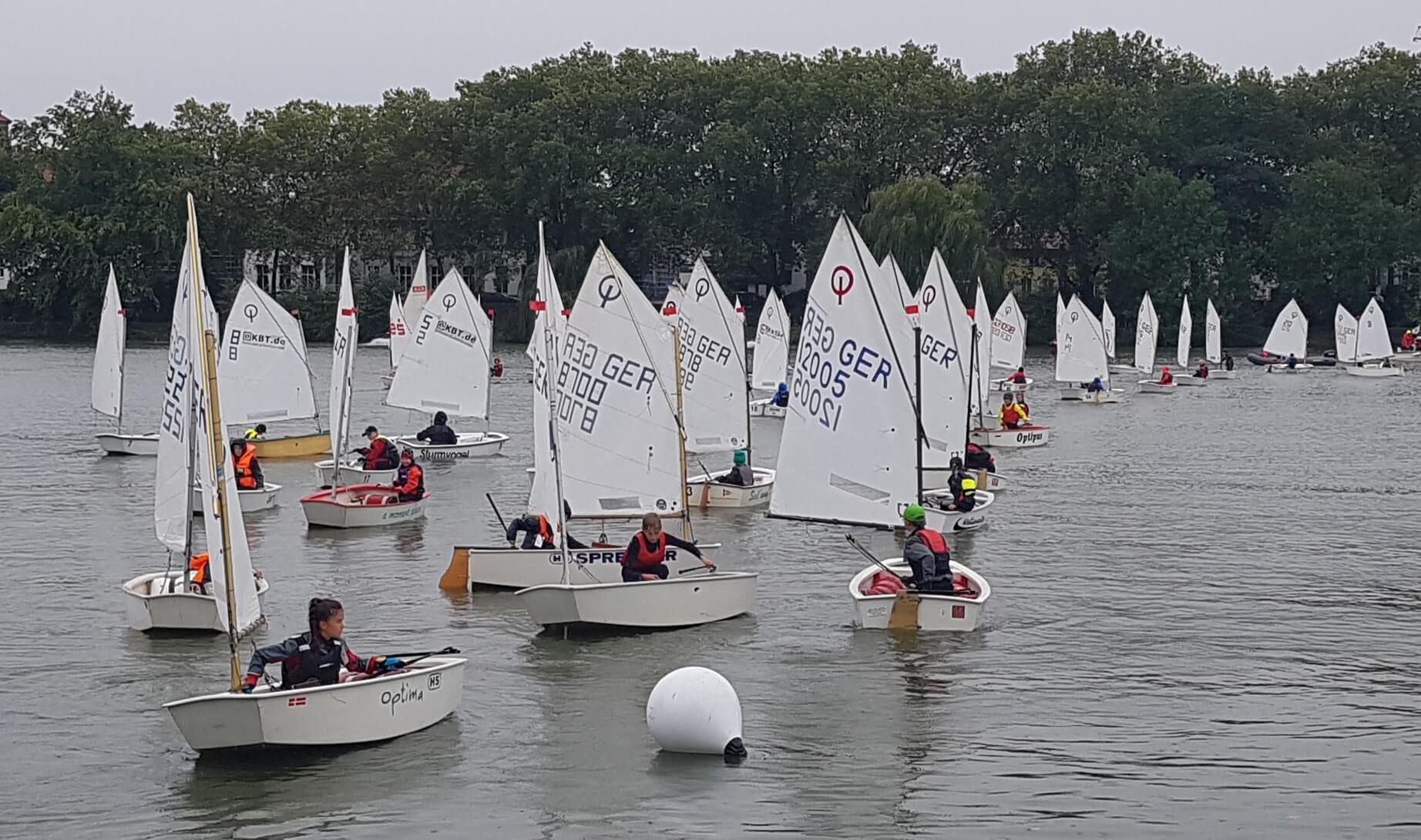 Ausgerichtet wurde das besondere Segelevent für die Jüngsten Segler auf dem Aasee von der Segelschule Overschmidt und dem Segel-Club-Münster (SCM). Es wurde in zwei Klassen – Overschmidt Segelschüler und Vereinssegler gestartet. 65 Boote waren gemeldet, wg. kurzfristiger Absagen gingen aber immer noch rekordverdächtige 52 junge SeglerInnnen an den Start. Trotz des regenreichen und für die Kids echt kalten Wetters hielten die Kinder vom SCM, vom Segelclub Hansa, vom WYD Möhnesee und der Segelschule Overschmidt tapfer und mit Freude durch. Gesegelt wurden 3 Läufe im Up-and-Down Kurs.