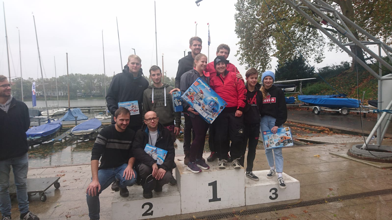 Wettfahrtleiter Jules Tronquet hat x Mal das Wetter geprüft und in den nassen aber windlosen Himmel geblickt, bevor er gegen Mittag mangels Wind endgültig die Traditionsregatta für beendet erklärte. Dann folgte in einer kleinen Regenpause die Siegerehrung auf dem völlig überfüllten Siegerpodest! Anschließend ging es - wieder im Schüttregen –an das Einpacken der Boote und der Heimweg der Gäste und den Rückbau des SCM Clubhauses, das ja an dem Wochenende sooo viele Gäste beherbergt hatte. Dann musste eben die Ergebnisliste auf Basis der vier Läufe erstellt werden. Das miese Wetter hatte nur den Vorteil, dass sich die Crews zeitiger als sonst auf dem oft sehr weiten Heimweg machen konnten.