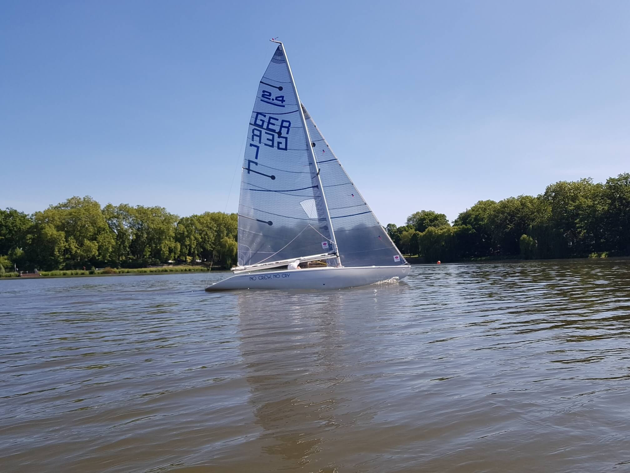 Uli Libor, mehrfacher Olympiamedaillengewinner (Silber + Bronze) und vielfacher Deutscher- und Weltmeister im Segeln (in verschiedenen Bootsklassen) hat diese Woche sein neues Boot – eine 2.4mR Rennyacht mit dem Namen NO CREW, NO CRY -auf dem Aasee erstmals ausprobiert und zusammen mit erfahrenen 2.4mR Seglern des SCM trainiert. Das Ganze fand unter Corona Bedingungen statt, allerdings ist das bei einem Einmannboot auch relativ einfach zu bewerkstelligen .