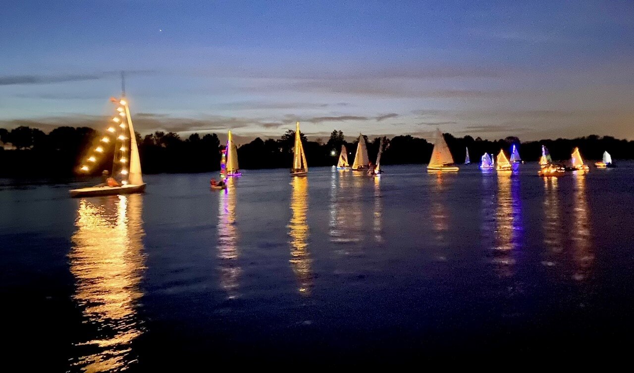 Das dunkle Wasser des Sees verwandelt sich in ein funkelndes Lichtermeer. Es wird still. Der Zauber der festlich erleuchteten Jollen zieht auch die zahlreichen Zuschauer am Ufer in seinen Bann.