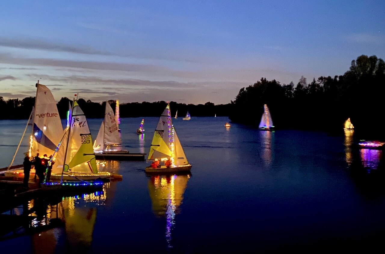Noch vor Einbruch der Dämmerung beginnen die Kinder und Jugendlichen mit der Dekoration der Boote und befestigen auf unterschiedliche Weise Lichterketten und andere Leuchtkörper an ihren Rümpfen und Masten. Der Sturm des Vortages hat sich gelegt und bei Einsetzen der Dämmerung ist es dann soweit: die liebevoll geschmückten Boote können zu Wasser gelassen werden. Unter die klassischen Schulungsboote des SCCR wie RS Fevas, 420er, RS Ventures und Optimisten haben sich an diesem Abend Familienjollen und sogar einige Stand-up Paddler gemischt. Zur Sicherheit begleiten Motorboote die zum Teil noch jungen Segler.