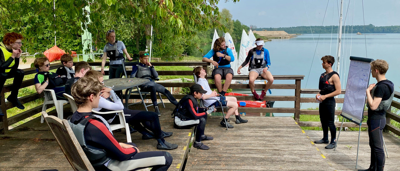 Am Samstagmorgen sieht man bereits beim Frühstück das Leuchten in den Augen der Teilnehmer. „Man weiß nie genau, ist es die Vorfreude auf die Wasserarbeit oder noch die Müdigkeit vom Kartenspielen am Abend zuvor…“ so Kolja im Interview. Bevor es jedoch aufs Wasser geht bekommen die Teilnehmenden in Gruppen eine Übung zugeteilt, die als Lehrprobe vorbereitet werden soll. Nach erfolgreicher Vorbereitung der Übungseinheiten geht es zum Boote aufbauen. Folgend stellen die Gruppen jeweils abwechselnd ihre Übungseinheiten in einer simulierten Trainingssituation vor. Dabei spielen die anderen Teilnehmenden die jeweilige Trainingsgruppe z. B. Spi setzen oder An- & Ablegen für 420er Umsteiger). Nach jeder Wasserübung gibt es an Land eine gemeinsame Feedback Runde, bei der es besonders um den Aufbau der Übung, den Umgang mit den Teilnehmenden auch unter Sicherheitsaspekten und die Fehlerkorrektur auf dem Wasser, geht. Trotz der hochsommerlichen Temperaturen und wenig Wind am Samstag, konnten beinahe alle Gruppen ihre vorbereiteten Übungen am Samstag präsentieren und nur eine Gruppe musste bis Sonntag auf ihre Lehrprobe warten. Der erfolgreiche, aber auch anstrengende Segeltag, bei dem die Teilnehmenden jede Menge Wissen aufnehmen und verarbeiten konnten / mussten, wurde gekrönt vom gemeinsamen Grillen, mit freundlicher Unterstützung von Martin Heisterkamp (Jugendwart Boh-YC). Nach dem Essen folgte selbstverständlich noch Theorieunterricht mit dem Fokus auf die Reflexion der Wasserarbeit, um das zuvor erlernte noch einmal zu festigen. Abgeschlossen wurde der erfolgreiche Tag mit einer oder auch zwei Runden Werwölfe.