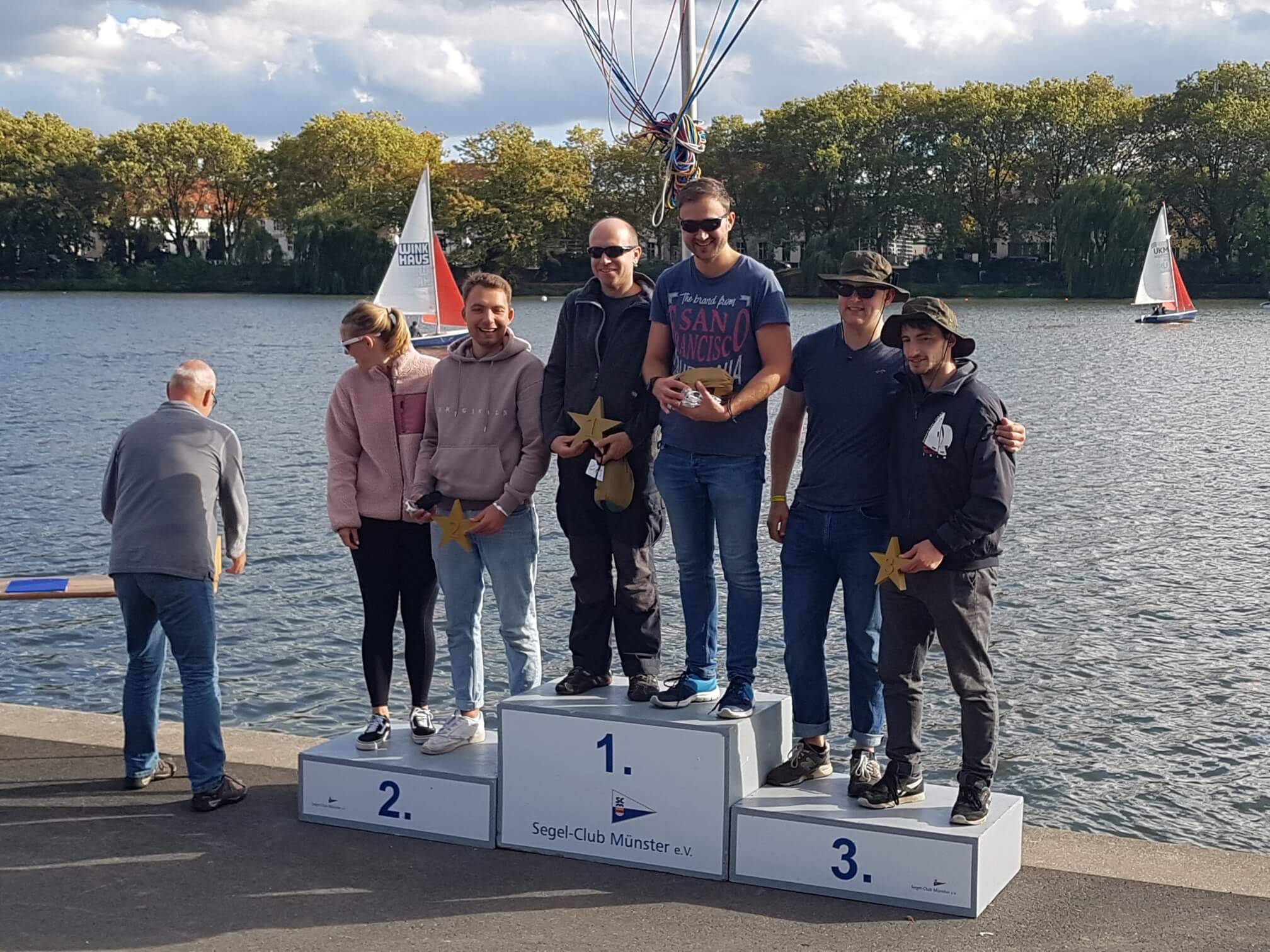 Besonders bemerkenswert war der vierte Platz von SCM-Clubchef Matti Unger (38) mit seinem 9jährigen Sohn Julius. Die Starts unmittelbar am Spazierweg am Ufer bei der Bastion waren für die Zuschauer in der Segelarena am Aasee ein tolles Erlebnis. Laufend wurden die Abläufe für die Spaziergänger und Zuschauer, aber auch für die pausierende SeglerInnen über Lautsprecher erläutert und die Ergebnisse durchgegeben.