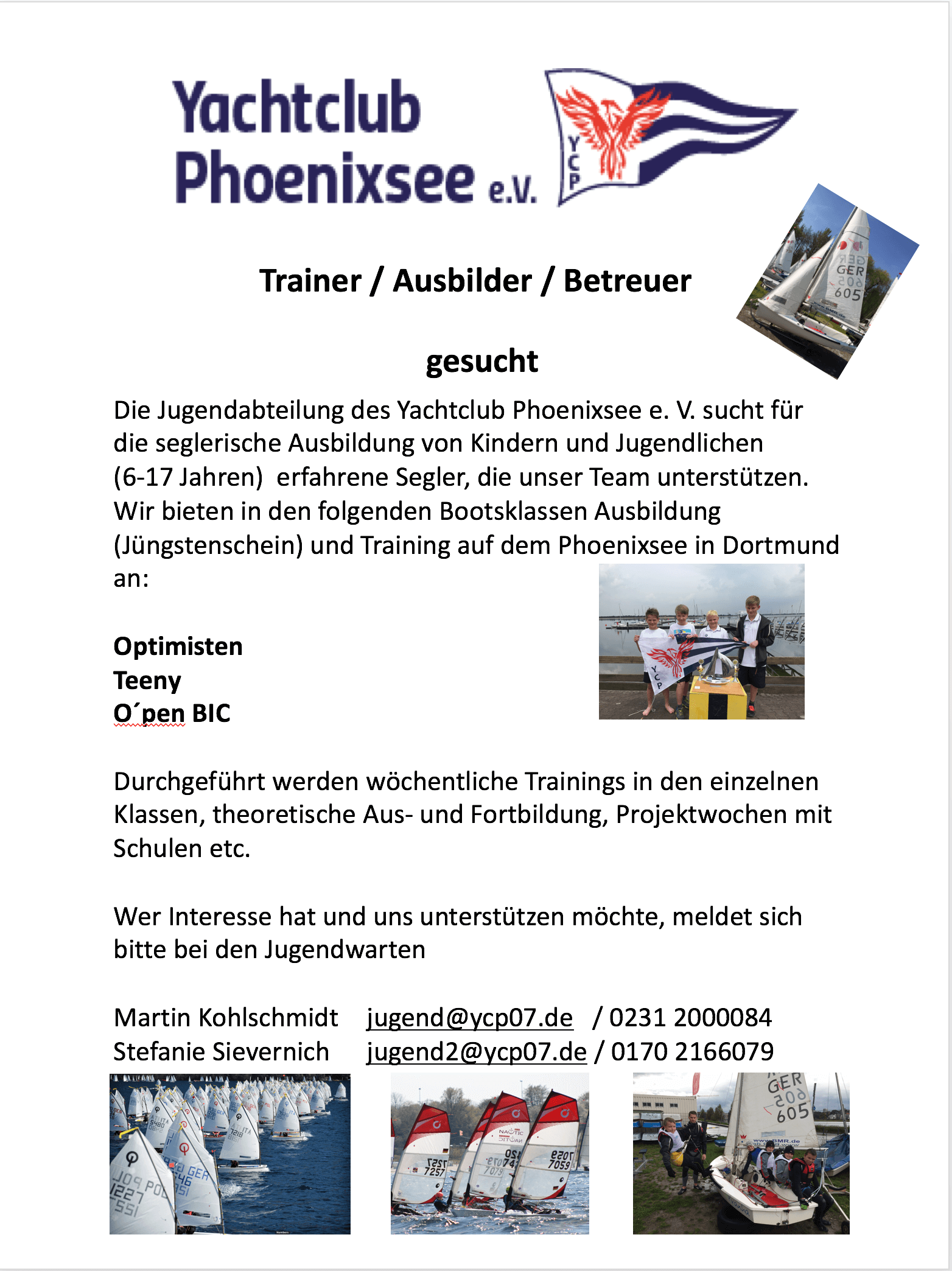 Die Jugendabteilung des Yachtclub Phoenixsee e. V. sucht für die seglerische Ausbildung von Kindern und Jugendlichen (6-17 Jahren) erfahrene Segler